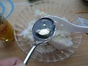 1.煮好的米饭趁热倒入寿司醋,搅拌均匀。