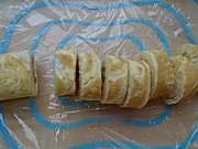 10.全部卷好,再把保鲜膜卷上,放10分钟。