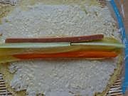 3.胡萝卜切条,开水煮软。黄瓜切条、大根切条、火腿肠切条。