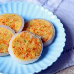 锅中抹少许油,放入洋葱圈,将混合食材填入洋葱圈,待底部凝固后反面,煎几分钟即可~