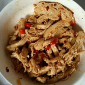 放凉后,把鸡肉撕好。热锅热油,放入辣椒,大蒜,姜丝翻炒出香。关小火,放入,鸡肉,酱油适量,食盐适量,2勺糖翻炒几下。