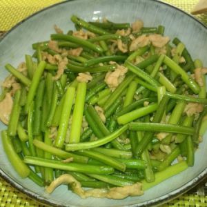肉丝炒到半熟后加入蒜苔继续翻炒。