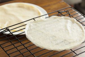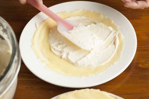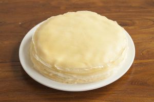 组装一下,一层皮上面放一层榴莲泥,可以用手按压一下,这样会比较均匀。重复以上动作,直到铺完最后一层就可以啦。