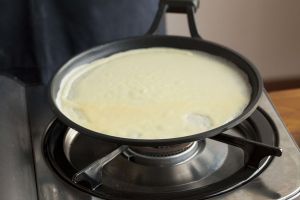 小火加热平底锅,摊面皮。(有小气泡,表面平就可以了)