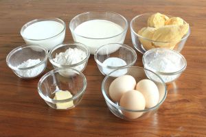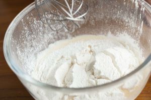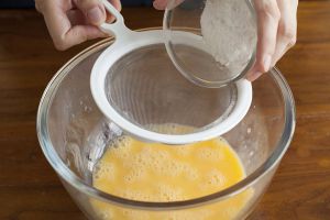 筛入低筋面粉和玉米淀粉拌匀,变成牛奶糊,再倒入剩下的牛奶。