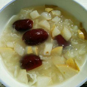全部食材,银耳泡发洗净撕小块,红枣洗净,梨洗净切丁,