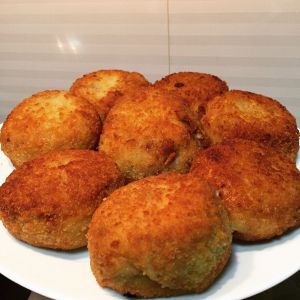 将炒好的洋葱和肉倒入备好的土豆泥中