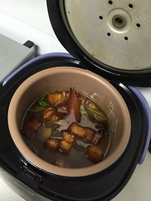 选择电饭锅的煮饭键,等着就好了。等到电饭锅提示已经保温状态时,把肉重新放回铁锅内大火收汁就好了,把五香八角,生姜葱的全部扔掉。