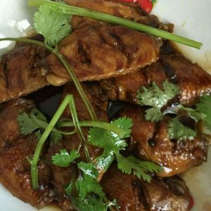 出锅,将鸡翅装盘,将香菜切段撒在上面!再将酱汁淋在上面!
