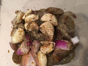 首先处理鲜虾,剪掉虾鳌、虾须;用牙签挑虾身的第二节部位去除虾线!然后再腌制,放入洋葱片、蒜瓣、白糖、生抽、食用油、意式混合香草、研磨黑胡椒碎,适量就好,可依据个人口味调整