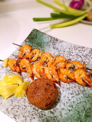 取出摆盘可以上餐了!配个面包和水果,晚餐就解决喽……略带菠萝香,虾很多汁入味噢!