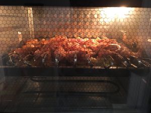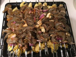 腌制三小时左右就可以串签字上了!请注意烤盘上平铺了一层凤梨皮噢!不用太多,有一些就够了,穿串也可以考虑美观加上青红椒,我这个只有腌料里的洋葱和蒜瓣