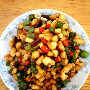 在将锅里油倒出一点,再把辣椒杏鲍菇和其他调料一起到入锅里翻炒一会加入鸡丁放老抽,盐鸡精,一起翻炒