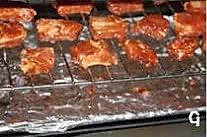 开始烤肉啦。把肉均匀的码放在烤架上,将肋排肉厚的那面冲上,放置在中层。在烤盘中铺上锡纸。将烤盘放在烤箱的下层。烘焙的时候排骨会滴答很多的酱汁。用铺着锡纸的烤盘接着点事后比较好收拾。200度烘烤20分钟。
