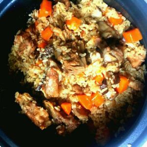 6.20分钟后将准备好的香菇,萝卜,豌豆加入排骨中,翻炒均匀后将所有排骨倒入装有大米的电饭锅中,等到米饭熟的时候一锅香喷喷的红烧排骨焖饭就做好了