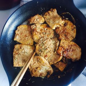 豆腐切厚片,大蒜剁碎;把酱油、香油、白糖、盐、百里香混合拌匀,加入适量清水备用。