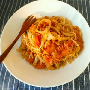 鱿鱼圈和蟹腿肉比较好熟,翻炒几下就可以放面条了,如果锅中汁比较干适量加点水,继续翻炒到收汁。