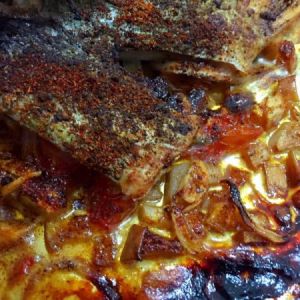 将鱼处理以后,用盐一勺、糖少许(提鲜)料酒半勺,蚝油半勺,腌制半个小时后,平铺在蔬果蒲上面压实一下,让鱼肉和蔬果充分接触到!