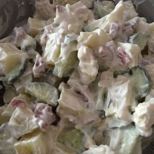 土豆切小丁烧熟,黄瓜切小丁,撒上火腿粒。最后拌上蛋黄酱,美美的色拉就完成啦!