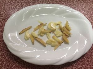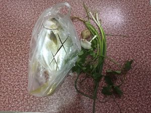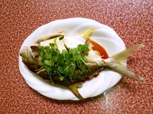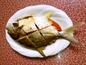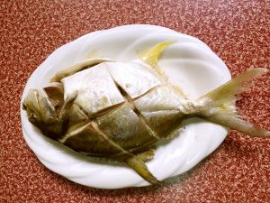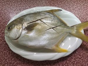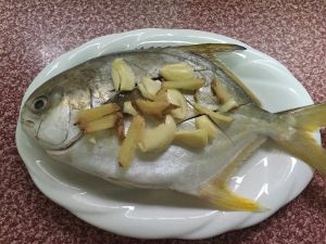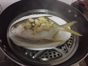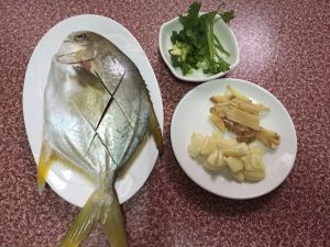 金鲳鱼去除内脏洗净后前后各切几刀,用盐腌制半小时。蒜拍破、姜切丝、葱切葱花、香菜切段
