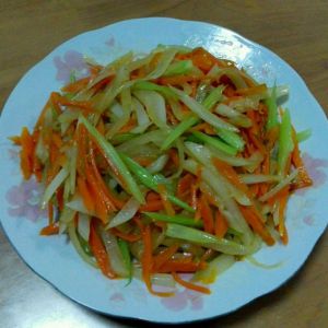 锅烧热,放多点油,下蒜末煸香,先放胡萝卜丝下去翻炒几分钟后再倒入白萝卜下去继续炒至萝卜丝变软。