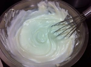 将2.3.4混合搅拌,倒入芒果,最后加鱼胶水搅拌到1