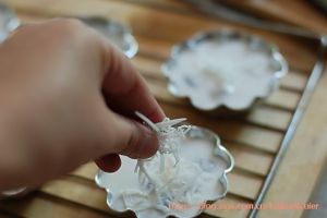 模具刷油防沾,一般的麦芬杯就行,不能用纸杯,因为是糯米的很容易粘,可以用硅胶模,也要刷油处理,但是用硅胶的模子不如金属模那样导热好,底和四周焦韧的口感不明显;