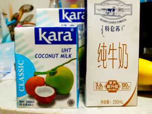 在碗中加入椰浆和牛奶以及适量的纯净水,(因为我用的是椰浆,比较浓稠所以要加点水,朋友们也可以直接用椰汁代替)。然后根据个人口味加点糖或者蜂蜜