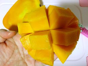 煮西米的同时可以切芒果啦,芒果竖着沿着果核切成两半果肉,然后再用十字纹在果肉上划开,从果皮那一面往上翻出来,然后再沿着果皮把一块一块的果肉切下来