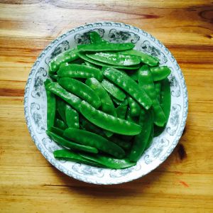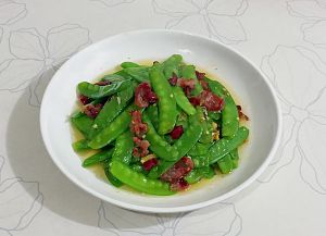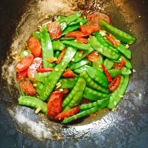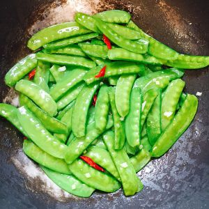 炒至干辣椒微焦黄,倒入荷兰豆,大火翻炒均匀。