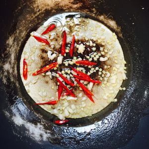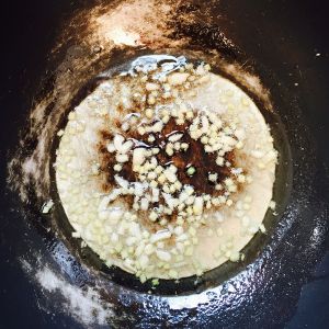 锅洗净擦干,倒入适量油,六成热时放入姜、蒜爆香。