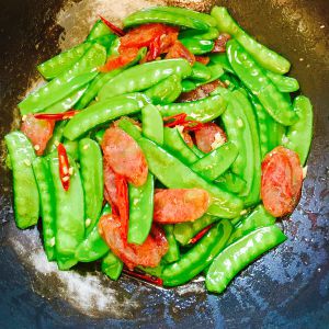 荷兰豆七分熟时,倒入蒸好的腊肠,放入生抽,适量盐,继续翻炒。(盐一定要注意用量,我吃得比较淡,都没有加盐,腊肠和生抽都含盐分)