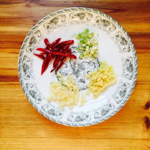 干辣椒切斜片,姜切姜米,蒜子拍碎切成碎粒、香葱切葱花。