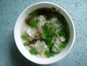 煮三分钟,碗里放香菜末,紫菜,鸡精,出锅