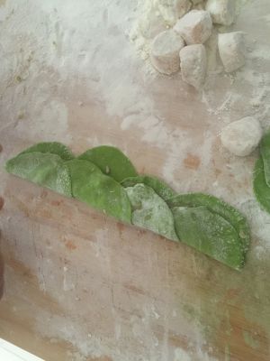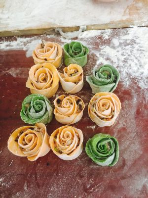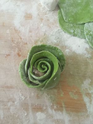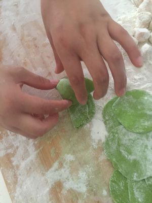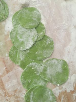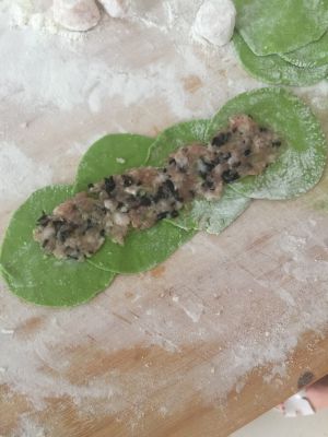排着顺序一层一层压上,放四个饺子皮,把剁好的饺子陷均匀放好