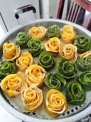 放入锅中大火蒸25分钟!这已经是蒸好的形状!颜色更艳丽啦!成品图!