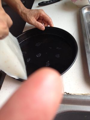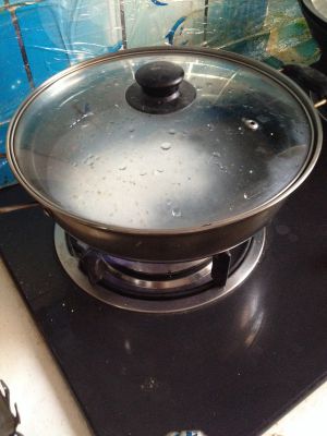 把披萨盘放入烧开的水中盖盖子大火烧都面糊鼓起