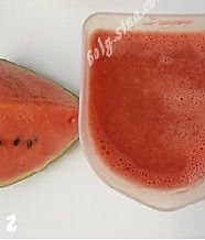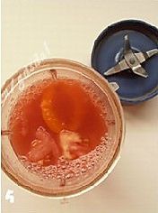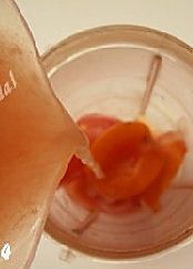 将西瓜汁倒入放有杏、番茄的料理机杯中;