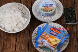材料:热米饭、百吉福芝士片 水浸金枪鱼、海苔