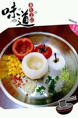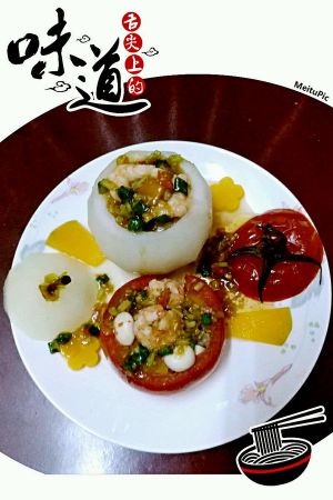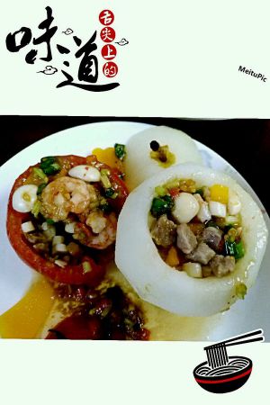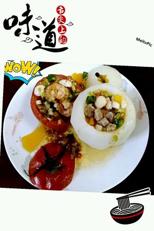 装好盖上西红柿梨盖,上锅蒸10分钟。蒸的过程做酱,下浮蒜蓉油,油不要下多,把炒材料的汤汁倒进去,下淀粉,盐,鸡精,最后下芹菜粒葱粒。蒸好把勾芡汁淋上去就可以了。