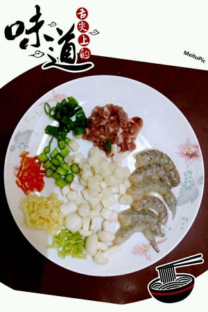 所有材料切丁,两只虾仁也切丁。猪肉丁,虾仁放淀粉盐鸡精蚝油腌制。