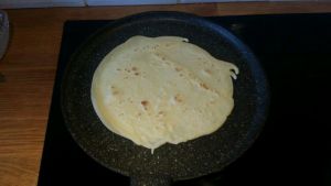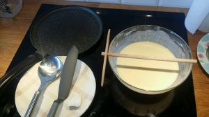 不沾煎饼锅抹油(用厨房纸吸了油擦锅,不要倒油入锅),我还使用了推薄饼用的这种木头T(不知道学名叫什么),用这个饼会比较薄,但是事实是我买错了饼推,这种不适合有锅沿的家用锅,所以饼很难做圆。