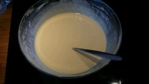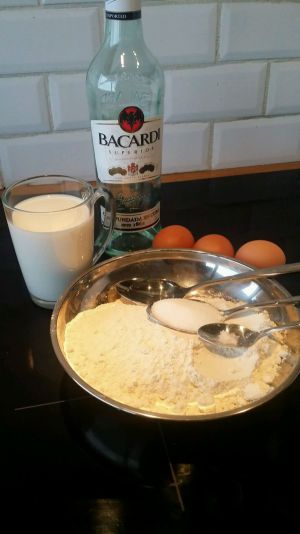 准备大碗,先将面粉,鸡蛋,盐混合,分多次加入牛奶(最好是冰牛奶),混合至均匀无颗粒。然后再按顺序加入糖,油和朗姆酒,用大勺子混合均匀。