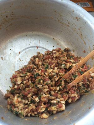 首先你需要先调好馅料,肥瘦相间的肉馅中放入剁好的白菜,加少许葱花,盐,酱油,搅拌均匀备用
