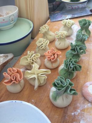 制作过程,将彩色的面擀成长方形,白色的面搓成圆柱,用彩色的长方形面裹紧搓圆柱。搓好后切成面剂子,擀成中间厚,四周薄的原片。中间填上馅料,馅料不能太多,要不然最后成形的时候会挤出来。将周围带颜色的部分向中间收拢,用拇指食指圈住掐紧,整理底部,放入蒸锅。