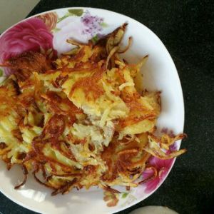 土豆擦丝。我是用擦子直接擦成了丝。鸡蛋打散。