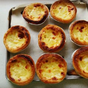 把水果放入蛋挞皮,摆在准备好的托盘里。