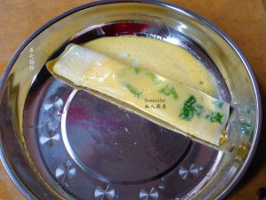 等水煮沸,放入肠粉盘子,隔水蒸约5分钟,蒸好的肠粉,有泡泡,这时候可以取出。放刚刚等待蒸的时候准备的另外一盘肠粉;PS:不需要关火,直接放去蒸。