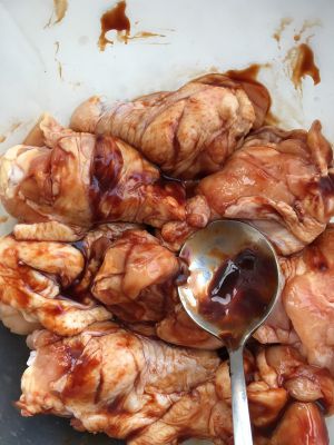把冻的鸡翅根化好,改刀切几下,方便入味。先用盐腌一下,然后用一勺海鲜酱拌匀,隔一段时间翻翻面,让鸡翅均匀入味。