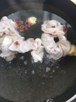 锅里放水,将大肠放入锅内,倒适量料酒,放几粒花椒和姜片煮开锅。咱们将大肠焯一下哈。